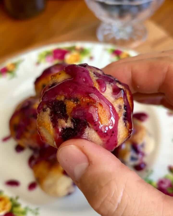 • Finish: Once the donut holes cool slightly, drizzle the glaze over top or dunk each one for extra blueberry flavor.