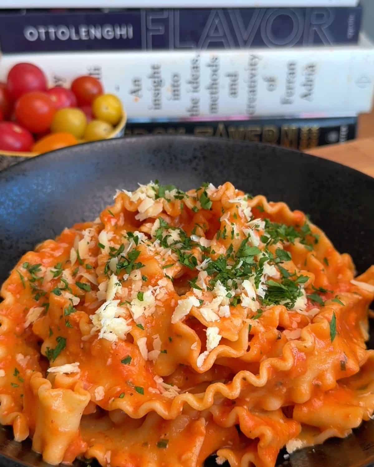 Instead of roasting tomatoes or blending them into a smooth sauce, we let them soften right in the pan and crush them into a rustic tomato base. Then the cheese melts in, the cream rounds everything out, and the pasta water ties it all together into something glossy and rich.
